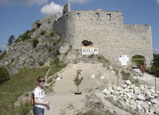 But the day was too sunny and bright to be in a bad mood, and we set out for the first highlight on today's agenda: Castle Čachtice. There are many well-known restored castles in Western Slovakia, but we had to see this one. A while ago, we had watched a movie with a Czech actor that we quite like, Petr Jákl, about the Hungarian countess Elisabeth Bathory. She was known as the "female Dracula" because she supposedly murdered a lot of her female subjects and bathed in their blood to keep herself young. Castle Čachtice had been her residence in Slovakia, and so, naturally, we had to visit it. It was only a small detour from the main route, so we figured that we could visit it quickly and, an hour later, be on our way again.