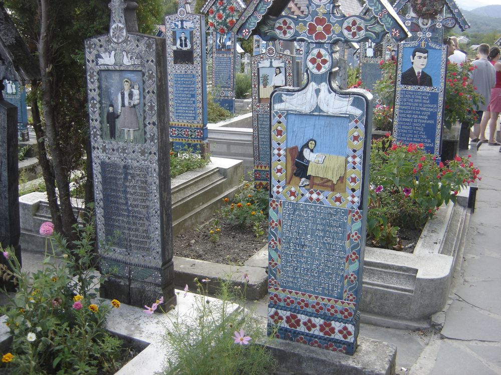 As we had turned our watches forward one hour when crossing into Romania, it was getting late when we arrived at our first sightseeing attraction for the day: the "Merry Cemetery" in the little village of Sapanta. In the 1930s, a local artist had started painting colourful and often humourous gravestones for each village member who was buried there. Most gravestones cartoonishly depict the person when he or she had been alive, with a witty, endearing or funny episode of their lives retold. Thus the characters of the dead stay alive for their descendants, and they are fondly remembered. The whole cemetery is kept in blue and red colours, which makes it very happy, vibrantly celebrating life in all its facets, instead of mourningly deplore death. We loved the spirit of the place. Even though this was a far-off little village deep in the Maramures region of Northern Romania, there were some tourist groups and also individual people walking around the cemetery. An elderly man, presumably a local guide, described the meaning of the tombstones to a group of visitors. Unfortunately we didn't understand him, because he was talking in Romanian. But we could make out the general meaning on some of the headstones, comparing the Romanian words to other Romance languages that we knew. The pictures on the stones helped too.