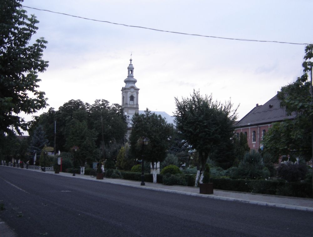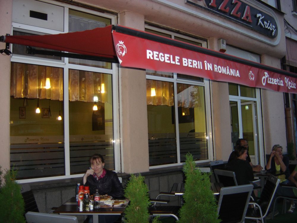 We strolled toward the main street. There we found a beautiful church behind a pretty little park. There was barely any traffic, it was quiet and peaceful. We also found a nice pizzeria. As it was still warm outside, we sat down on the sidewalk to have a bite to eat. The waitress brought us the menu card which was, obviously, in Romanian. We leafed through the numerous dishes on offer. Sonia quickly settled on a pizza. But I wanted to try a local dish. Sadly, I didn't understand any of the words, I couldn't even make out where the meat, fish and vegetarian dishes were on the menu. The waitress couldn't help us, she didn't seem to speak a single word of English, French, Italian, German or whatever else language we threw at her. So I decided to be adventurous and pointed at the very first dish on the menu: "I'll take that, please." The girl didn't look convinced. Worried, she shook her head and said: "No meat." No meat? Meaning, they had run out of meat? Or meaning that this particular dish did not contain any meat? Hmmm, odd. She seemed determined not to serve me this. Looking at the price, I noticed that it was very cheap, much cheaper even than the other dishes on the page. She thinks it's not a good idea, so let's not risk it. My finger wandered on and settled on a dish further down, square in the middle of the page. "How about that?" She seemed satisfied and left with our order. A while later, she came back with a yummy-looking pizza for Sonia and a huge plate full of meat and cucumber salad for me. The food was delicious. Good choice! Back home, we looked my first choice up in the dictionary: it would have been tripes! I had never eaten offal, and I wasn't particularly sad that the waitress had prevented me from doing so now.